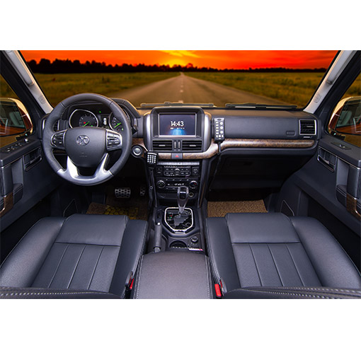 電子四輪驅動、智能一鍵啟動系統、發動機電子防盜系統、車內中控鎖、主副駕駛安全氣囊、電動外后視鏡(帶折疊加熱功能)、四門電動門窗、真皮方向盤、真皮座椅、駕駛座六項調節含記憶功能、空調、USB輸入接口,8英寸液晶顯示屏、藍牙系統、倒車雷達、倒車影像,GPS導航、氙氣大燈、LED日間行車燈、電子ABS+EBD、剎車輔助HBA、非承載式全金屬車身。